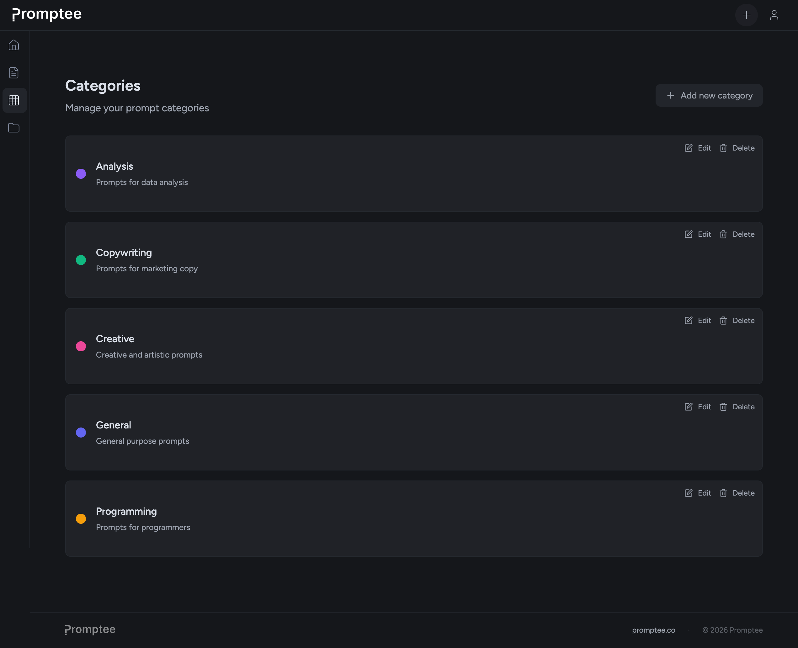 Paste any prompt into Promptee. Add a title, tags, and category to keep things organized from the start.